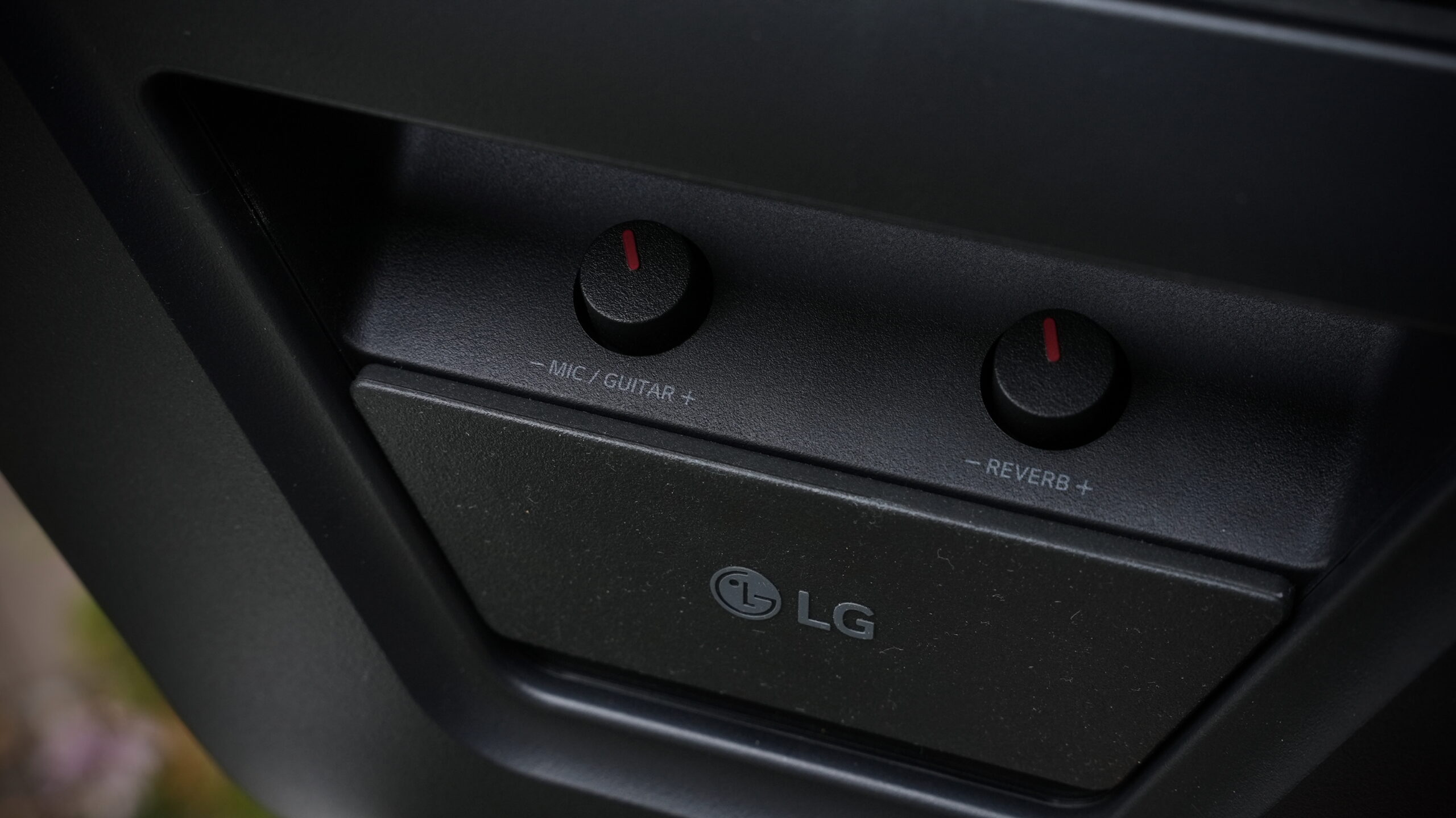All the primary controls sit along the top panel of the LG xboom Stage 301, and they’re both tactile and clearly labeled. Unlike many portable speakers, the Stage 301’s buttons are backlit, which is something I appreciate. It makes a real difference when you’re adjusting settings after dark. The volume ring wraps around the play/pause button, and in my testing, it feels intuitive to use without needing to look. Around the back, you’ll find additional knobs for mic and instrument levels, and it even includes built-in reverb to help you sound your best.
